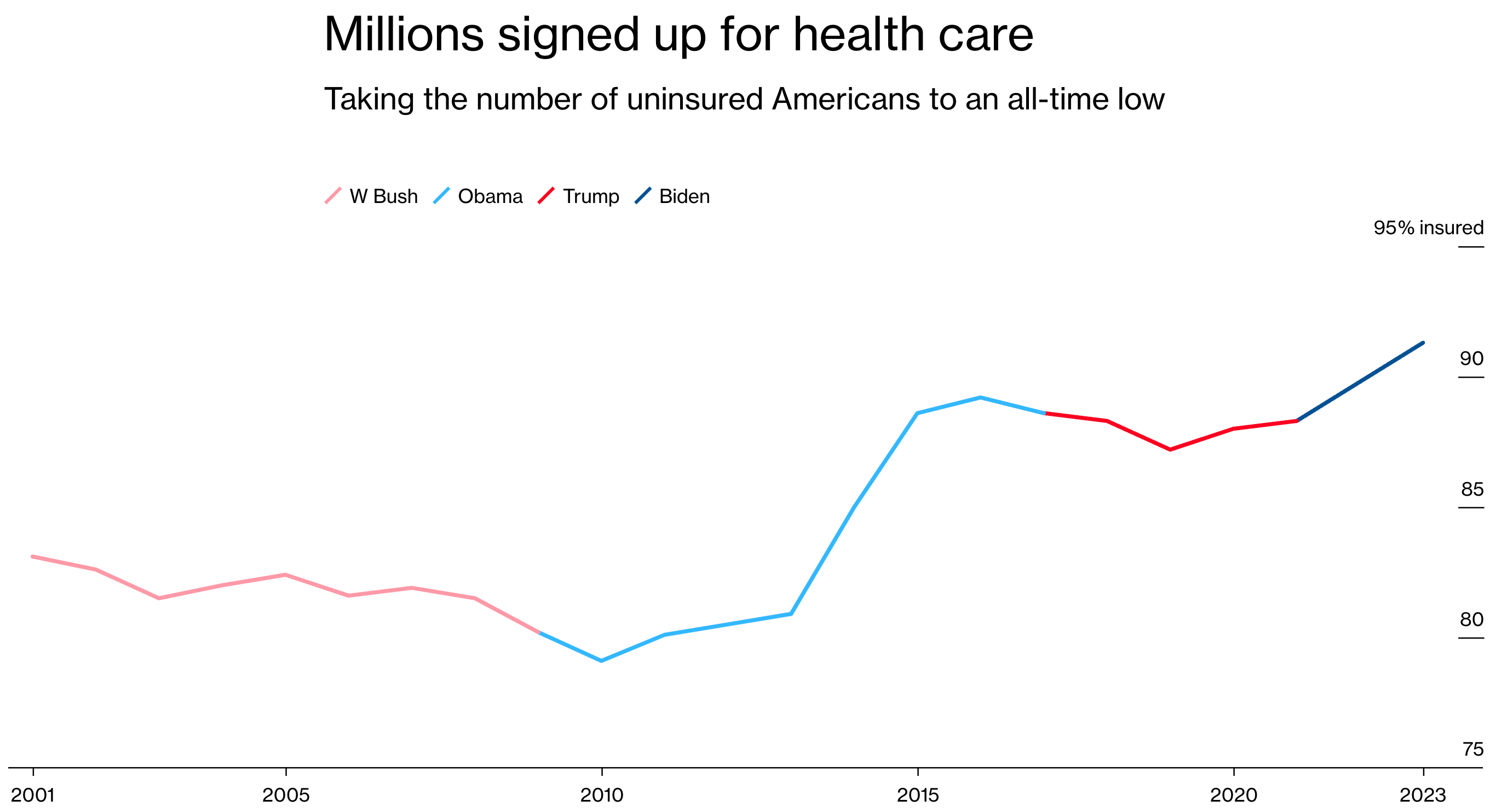 The number of Americans without health insurance reached a record low: Just eight percent by one estimate that isn’t the estimate used for this Bloomberg chart:
