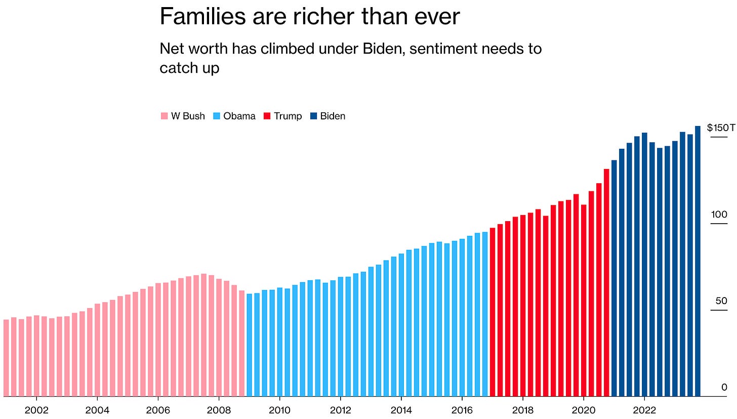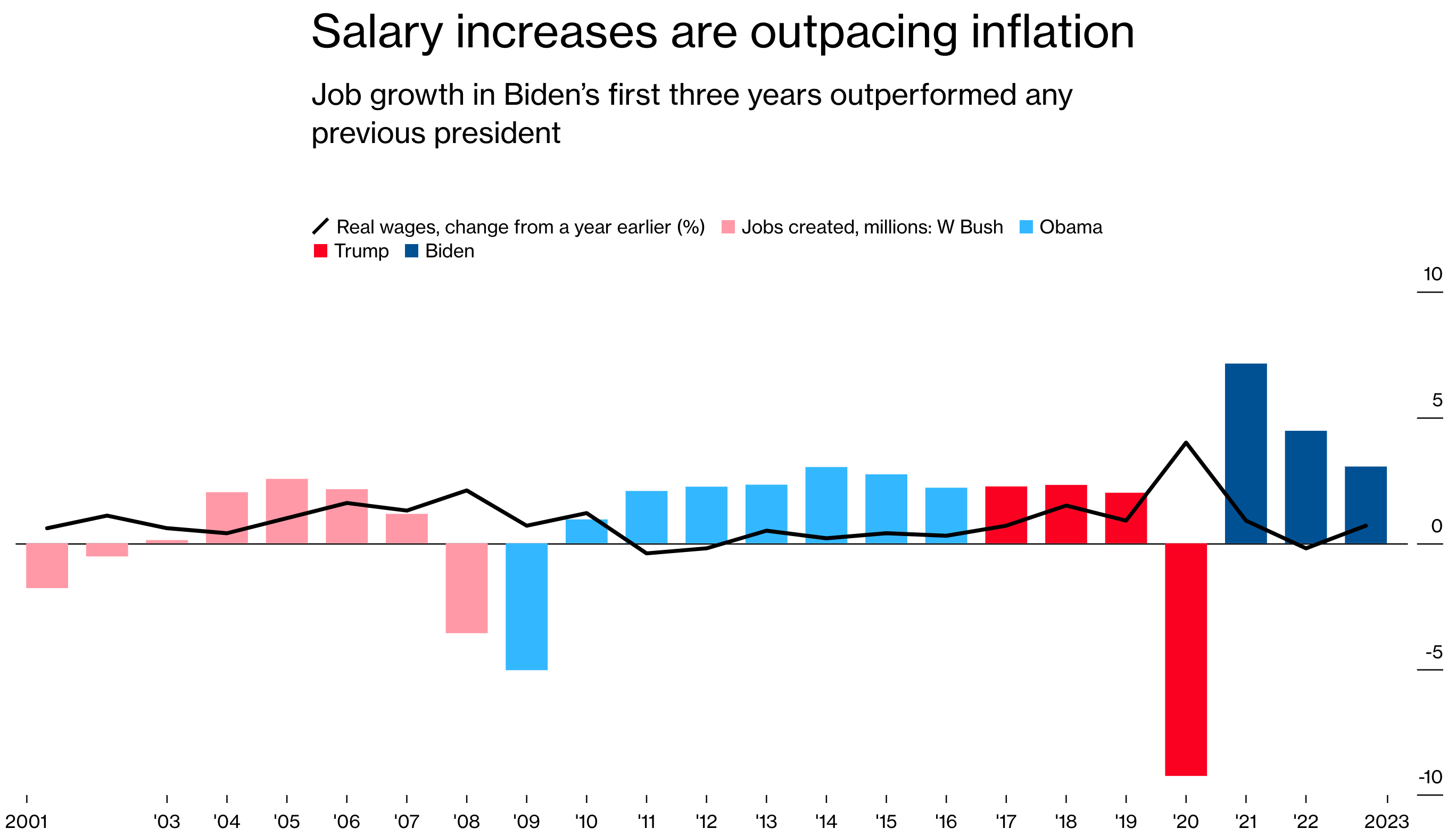 Under Biden, job growth outpaced the rates of any other president.4 Thanks to Democratic policies, as these Bloomberg charts prove — because they’re charts! — Americans had more money in their pockets than ever to donate to Trump.