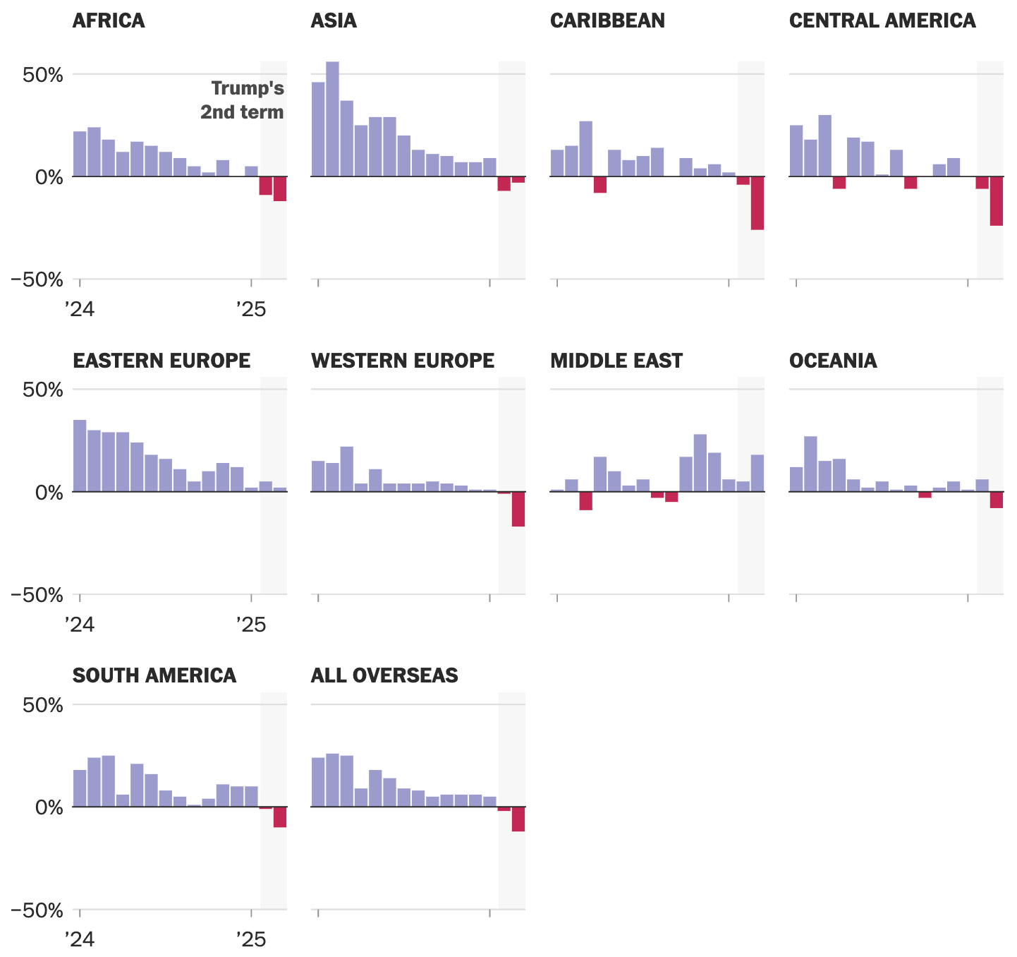 In a related-like-incestuous-spouses story, travel to the U.S. last month was down almost 12% from March of last year. And people are unflocking to the U.S. from almost everywhere, so much so that the Washington Post charted the monthly changes in travel numbers starting in January 2024. See if you can spot the Trump administration’s months!