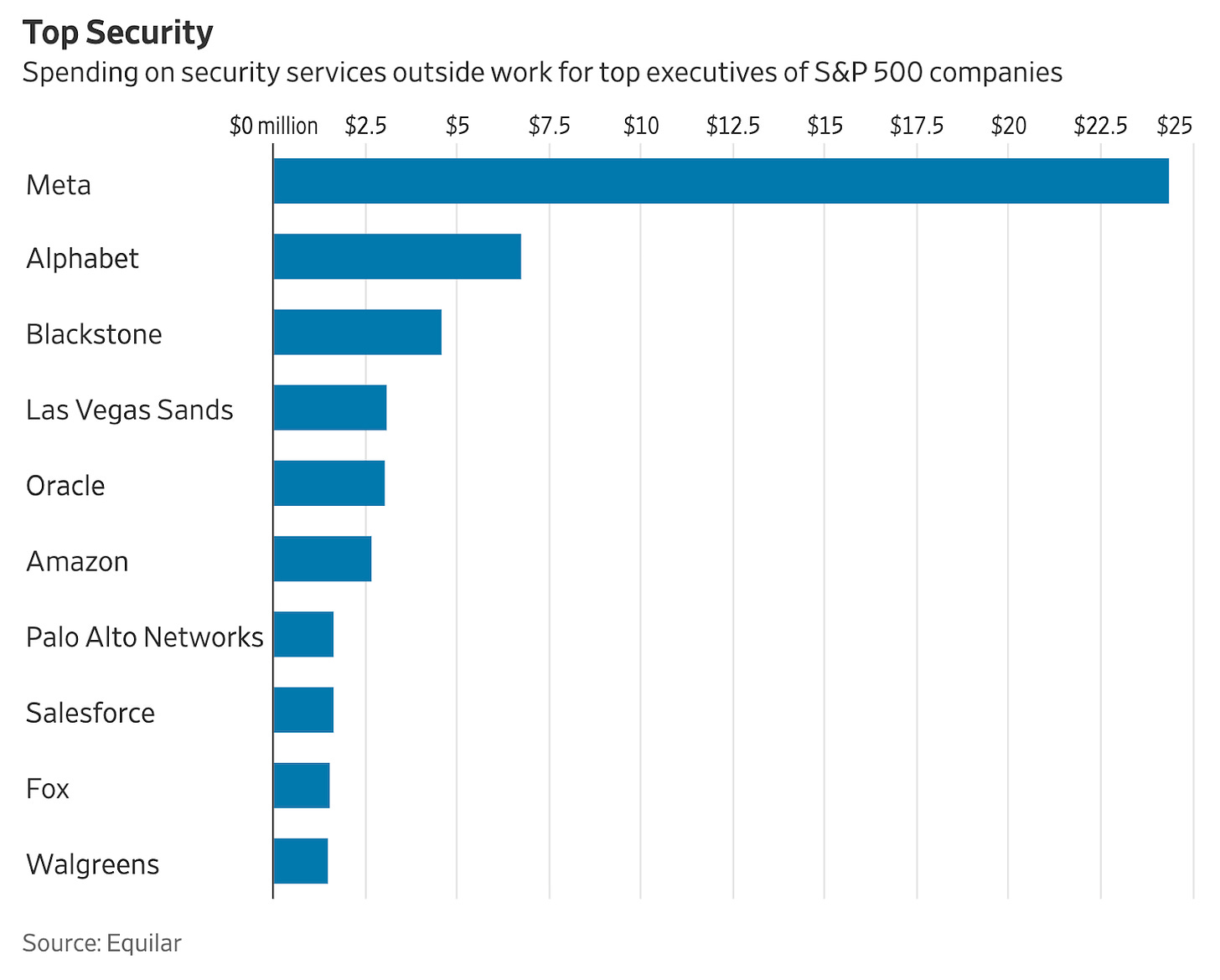 Already, more than one out of four of the Standard and Poor’s 500 companies provide security for top executives outside their plush, luxury offices. The Wall Street Journal conveniently charted for us how much some top companies spend on out-of-office security for America’s top robber barons: