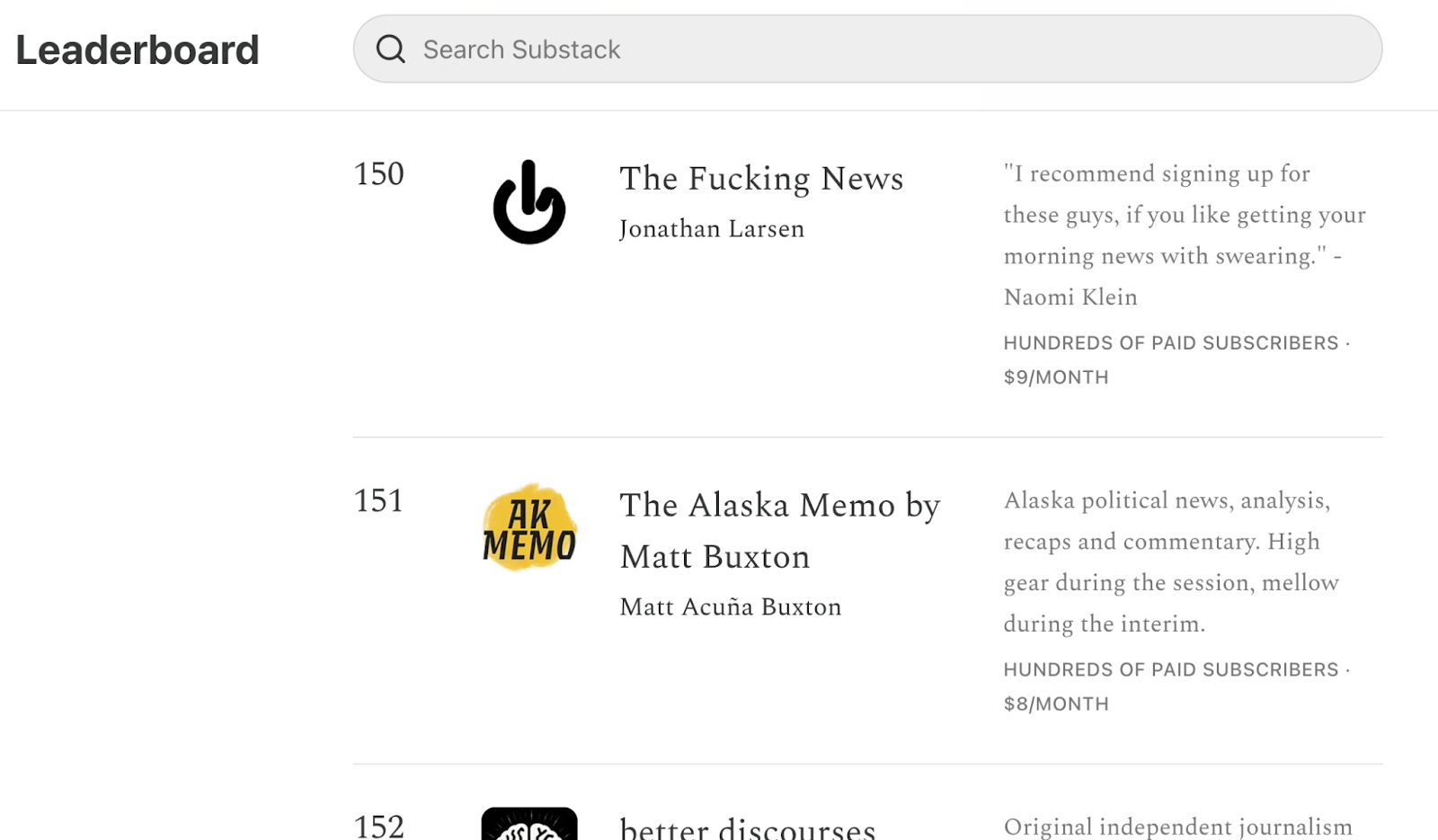 Substack has a leaderboard of political newsletters. When TFN launched we were at 215. This morning, we cracked the top 150. And with your help sharing and engaging and pointing out our newsfucking fuck-ups, we’re still growing. Thanks, Newsfuckers!