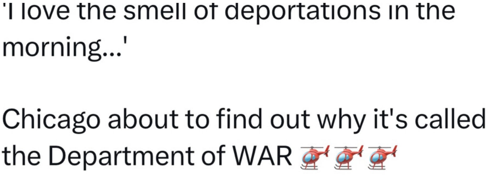 Trump’s remarks came after his declaration of war against Chicago on Saturday. Accompanied by the picture above, Trump posted the following: