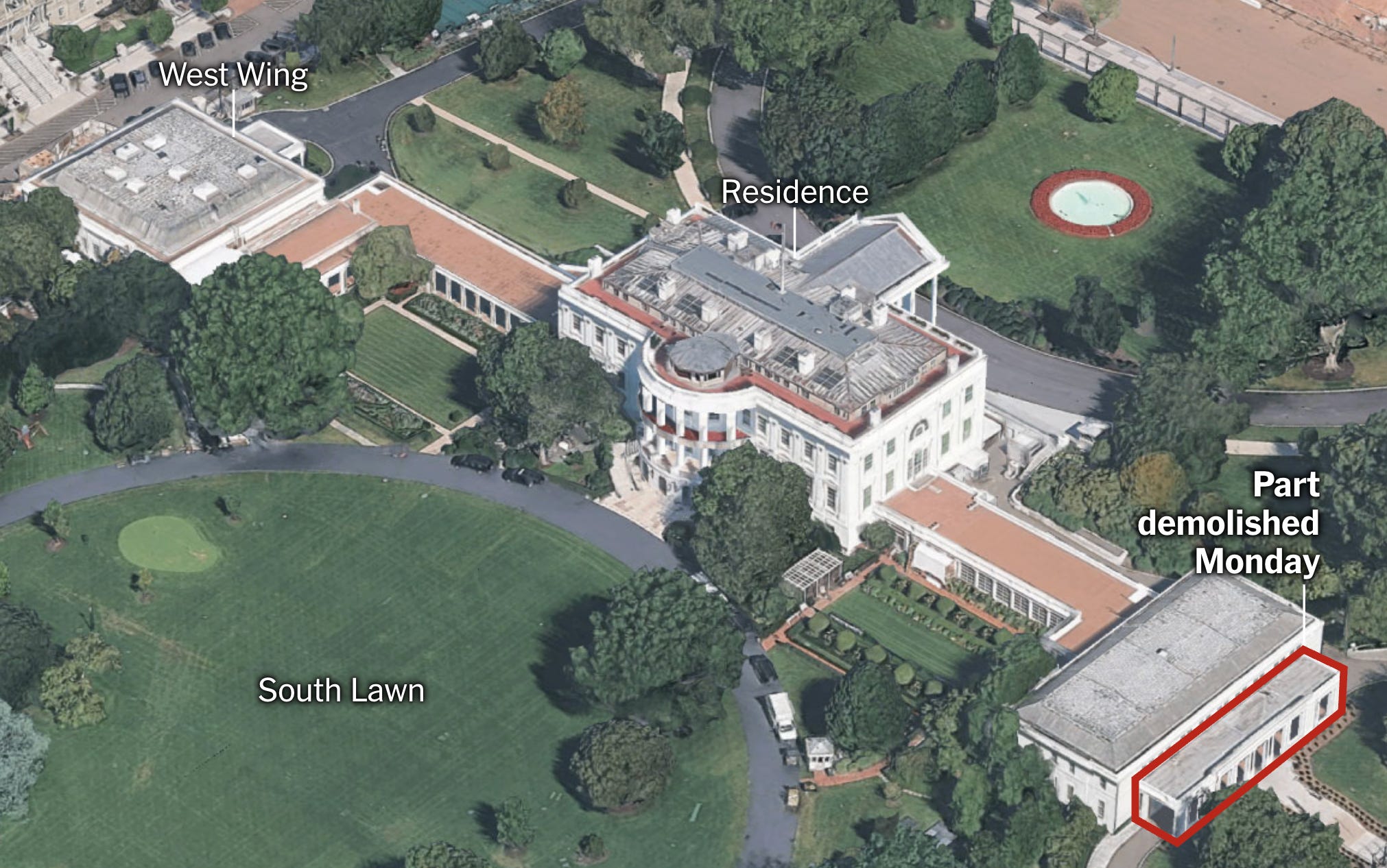 The New York Times captured a Google Earth image showing how the intact White House looked before the attack, highlighting the targeted area: