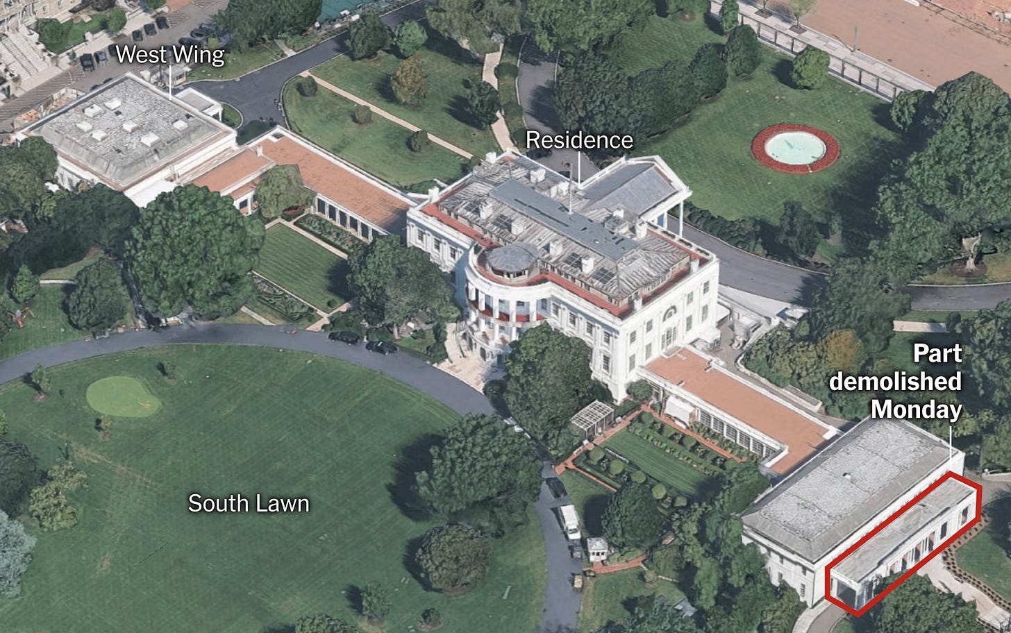 Oct. 21: Trump attack demolishes part of White House and, apparently, corporate-media memory that this is illegal … Vance in Israel to keep them in line and protect Hamas … Some GOP senators beg Trump to withdraw nomination of part-time Nazi for being too Nazi even for some GOP senators … Workers safeguarding U.S. nuclear-weapons stockpile get furloughed as :::gulp::: non-essential …