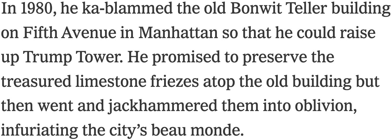 Beginning with civil-rights violations, Trump has been engaging in crimes against real estate and real people for half a century. And lying about his demolitions.