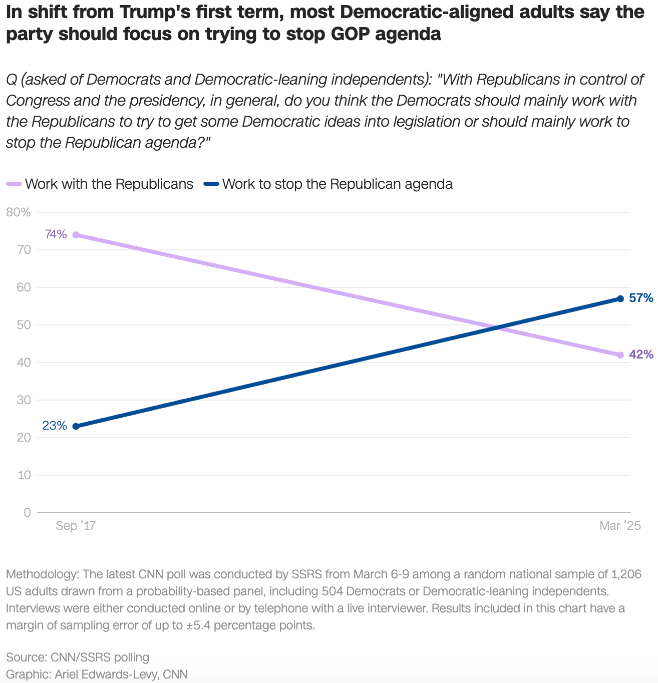 The reason for the drop is that fewer Democrats and aligned Independents support the party. And a majority, 57%, say the party shouldn’t work with Republicans. They say Democrats should fight Republicans. Y’know, like they’ve been supposed to since the founding fathers created an adversarial system that incentivizes rivals to compete for power.