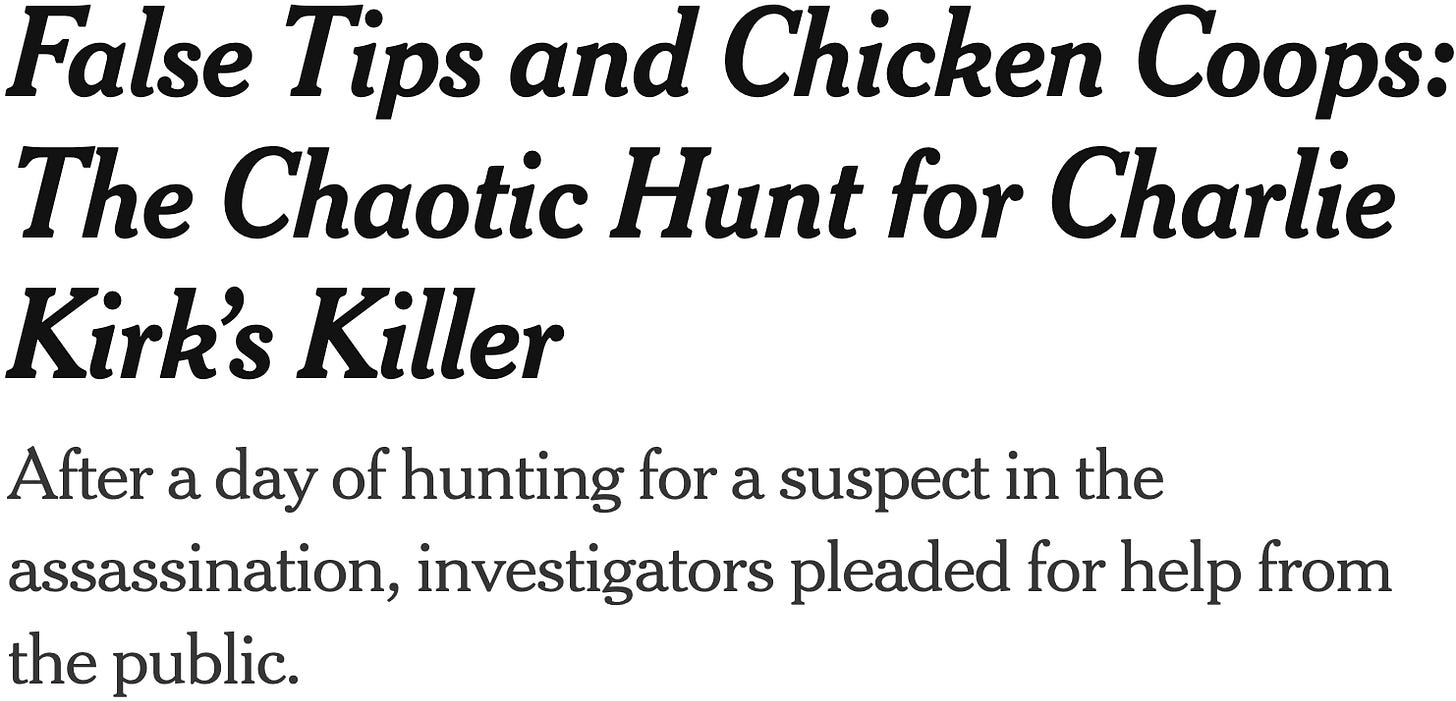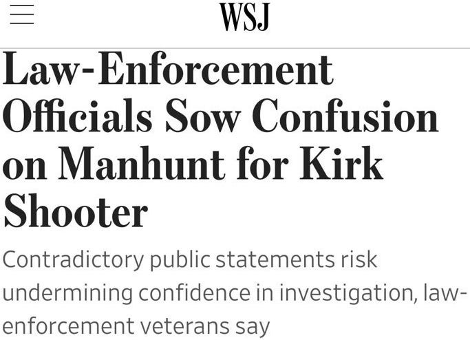 It’s worth keeping in mind that it took almost a week to find Luigi Mangione, the alleged probably-killer of United Health CEO Brian Thompson. So it might not be fair to blame the FBI or any law enforcement for the failure so far to even identify the killer of Charlie Kirk.