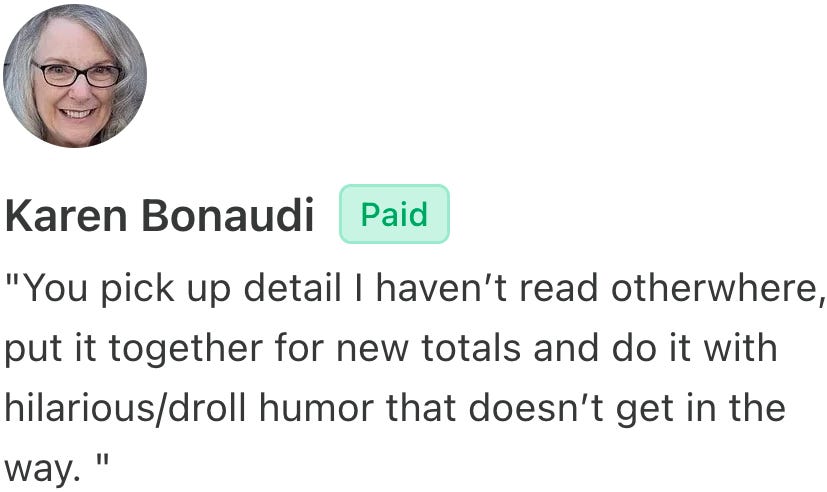 Thank you, Karen, for seeing the full scope of what I’m trying to do with TFN. Not just enough doofy Dad jokes to make the news tolerable, but details no one else has. Details that matter and affect how we see and think about things.
