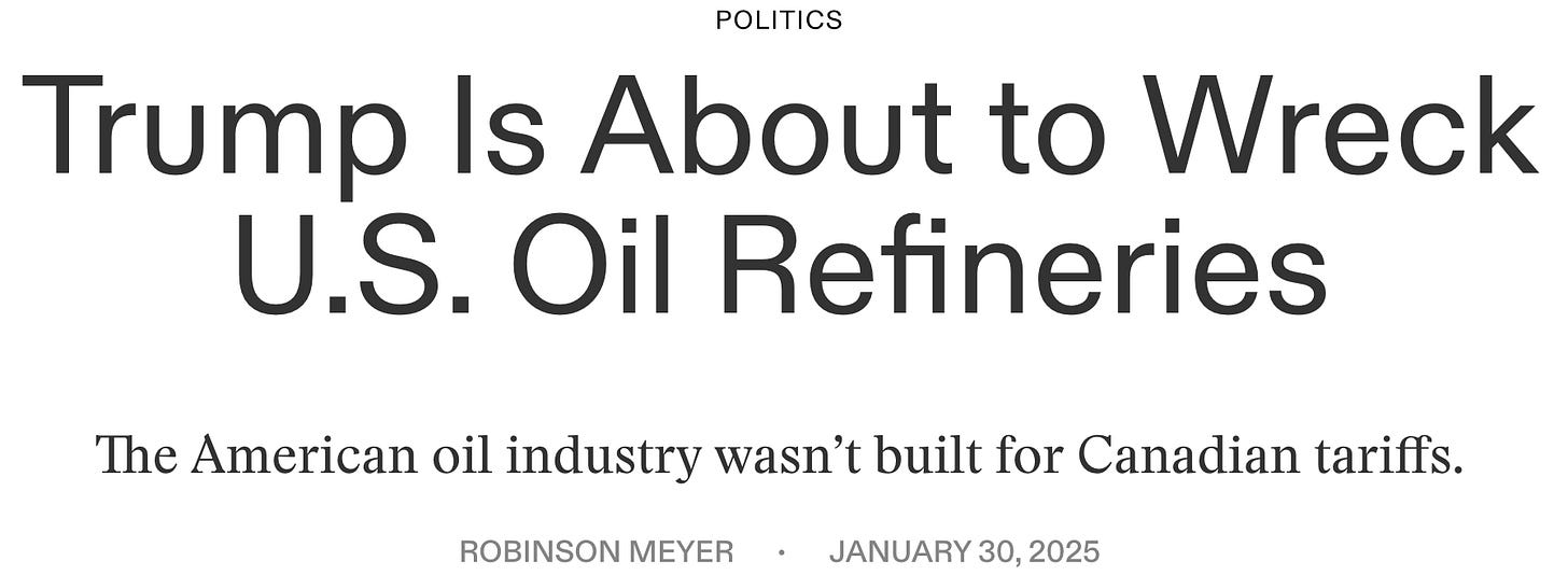 The Oil Price Information Service told the New York Times that 25% tariffs on oil would mean 15 to 20 cents more per gallon at the pump. (Trump’s tariffs are 25% on Mexican oil, but 10% on Canadian).