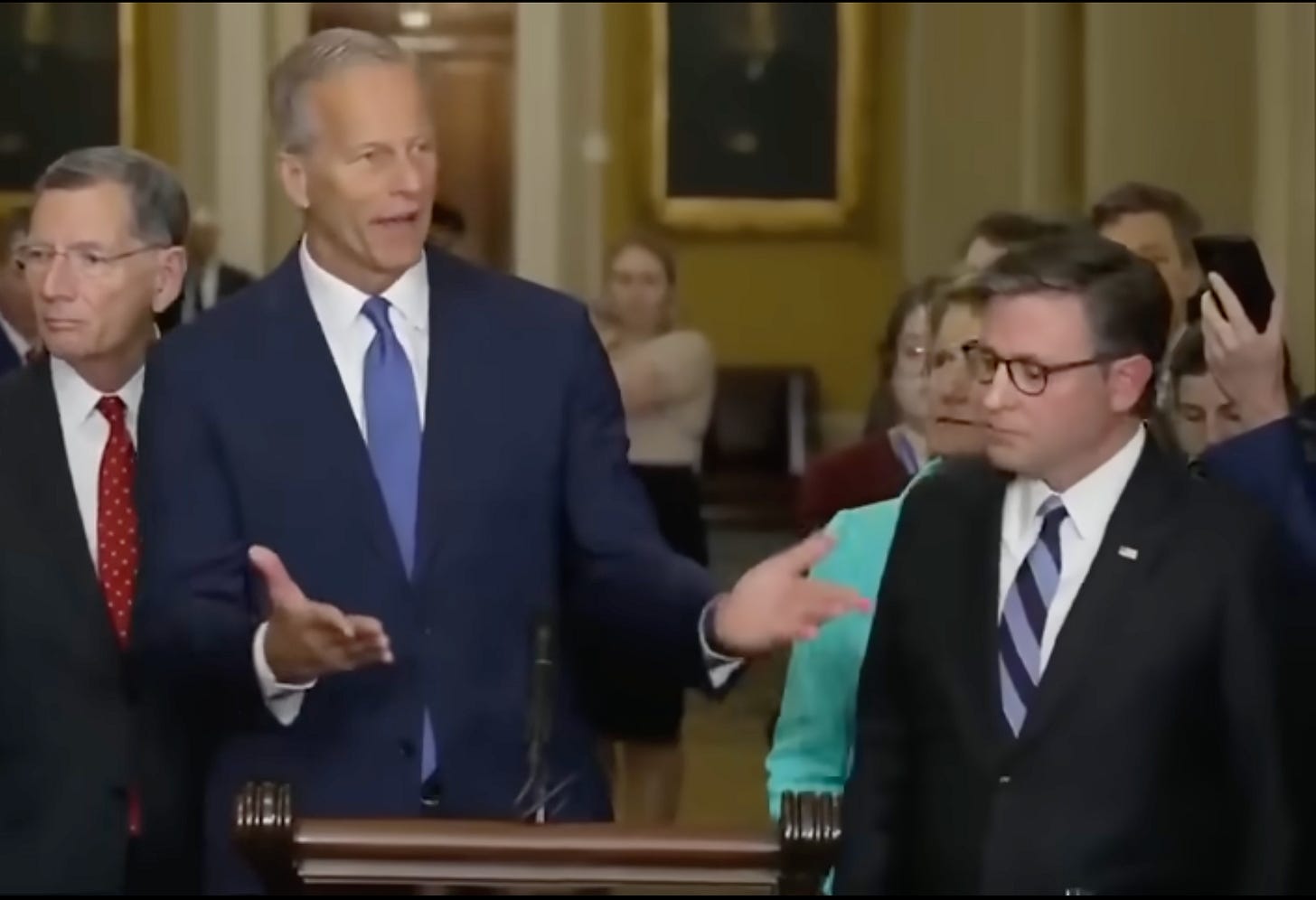 Thune: And honestly, I mean, you don’t need that. [Johnson nods his head in unity against his prior disunity]. … The simplest way to end this is not try to exempt this group or that group [like this fucking dweeb just suggested].