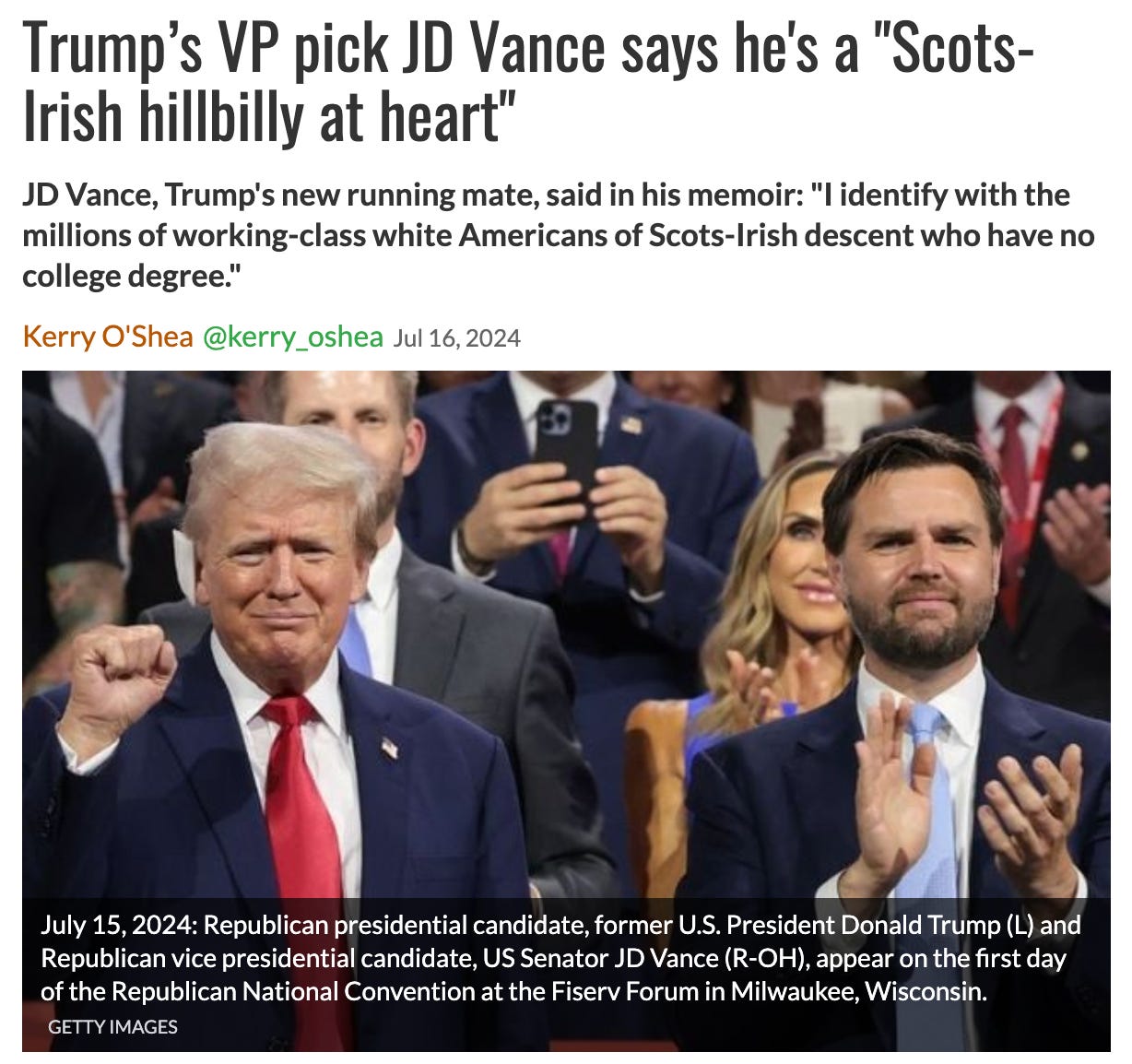 In fact, Vance is not merely a Hillbilly of Scottish descent and of Irish descent. He also identifies as American, a man, and a Catholic. He previously identified as atheist, Protestant, and a Never Trumper, making Vance some sort of freakish hybrid ex-Protestant ex-atheist ex-Never-Trumper Scots-Irish-American Catholic pro-Trump Hillbilly man.