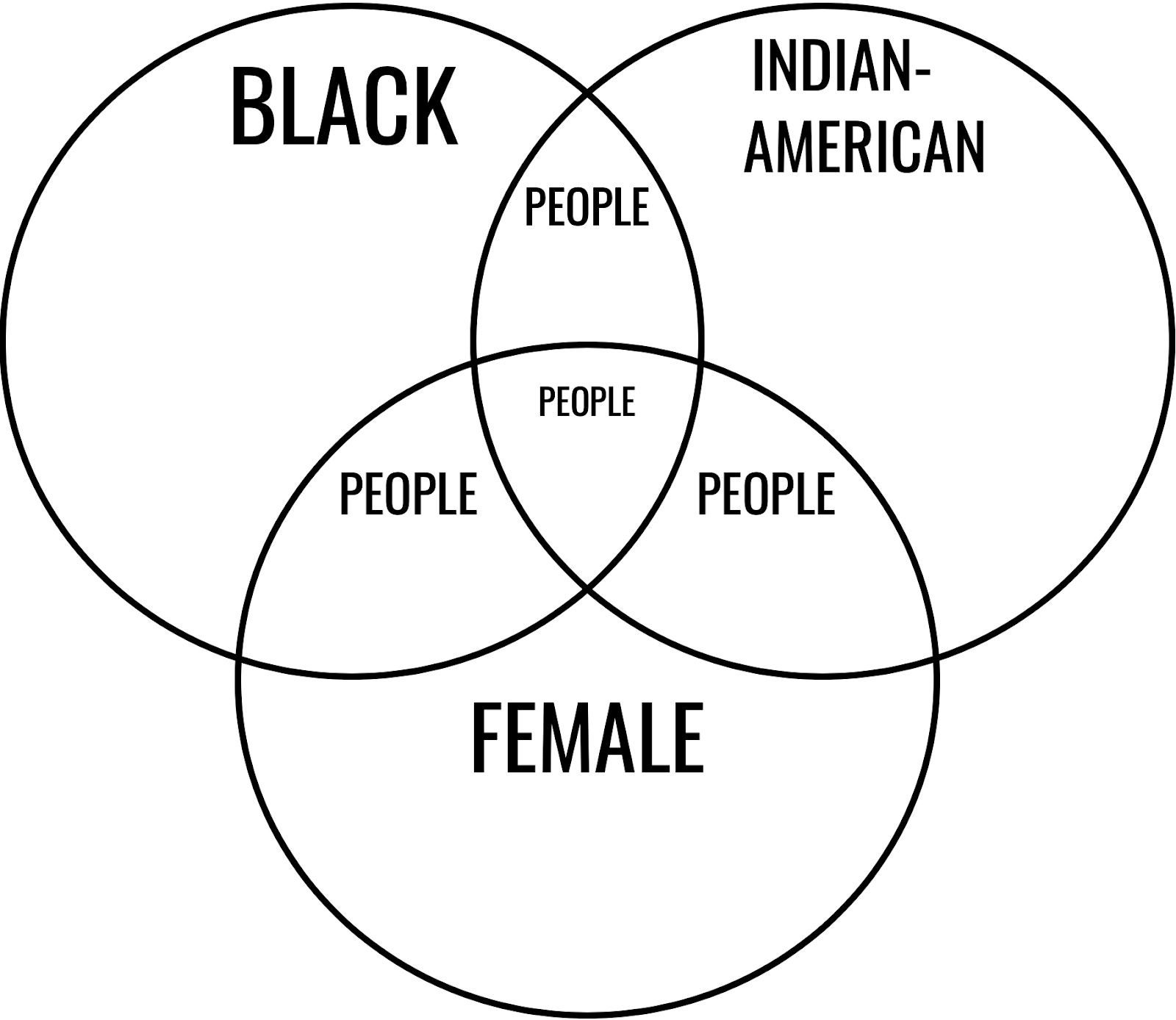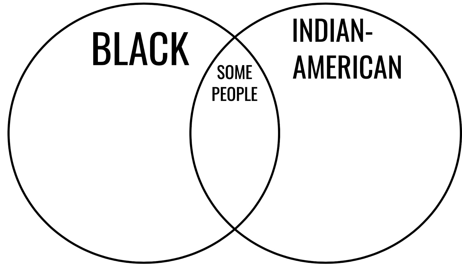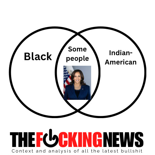 As multiple outlets reported, the result of that union, in a stunning advancement for the field of human biology, is that Harris is a Black Indian-American person. This dynamic can be easily represented in a Venn diagram:
