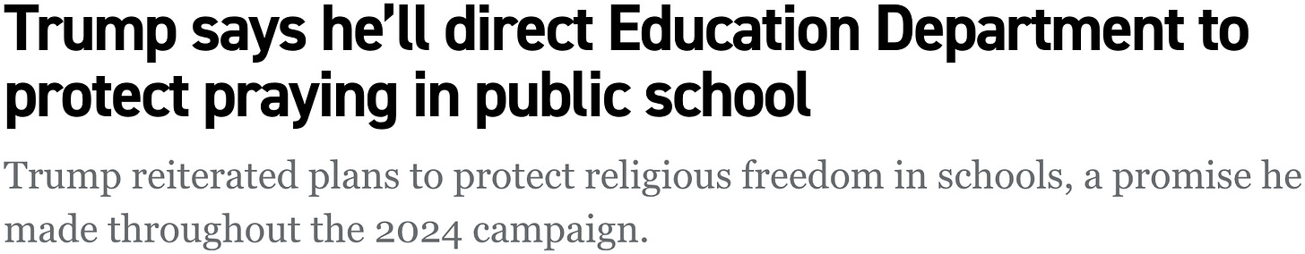 Trump also announced, or hinted, at some sort of new policy regarding prayer in public schools. Students, of course, are already allowed to pray, as it’s truly difficult to ban activities that typically take place silently in one’s head. They’re just not allowed to do it whenever and however they want.