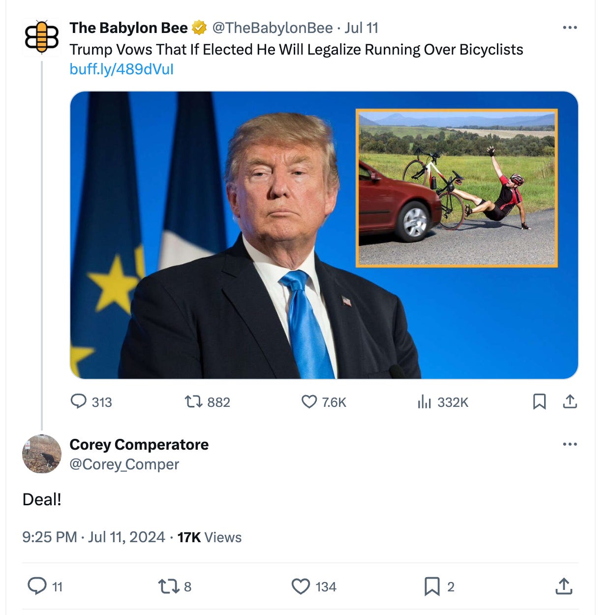 In fact, what they actually probably won’t focus on is one of Comperatore’s final Tweets. Responding to alleged satire claiming Trump would legalize running over bicyclists, he responded: “Deal!” That was two days before he was cut down by a bullet.