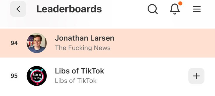 ICYMI First your ravenous TFN ate White House tariff czar Peter Navarro’s imported lunch on the Substack Leaderboard. Now we’ve just topped Libs of TikTok — truly one of the worst, most vile and unprincipled spreaders of toxic, divisive, shitty bullshit.