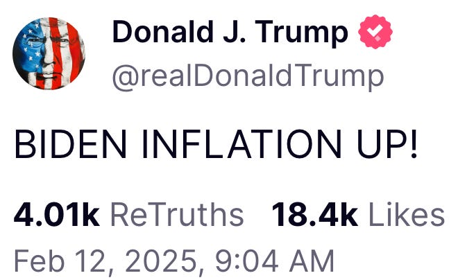 Ignoring his promise to lower prices starting on day one, Trump responded to the new inflation numbers this morning by blaming the not-president, Joe Biden.
