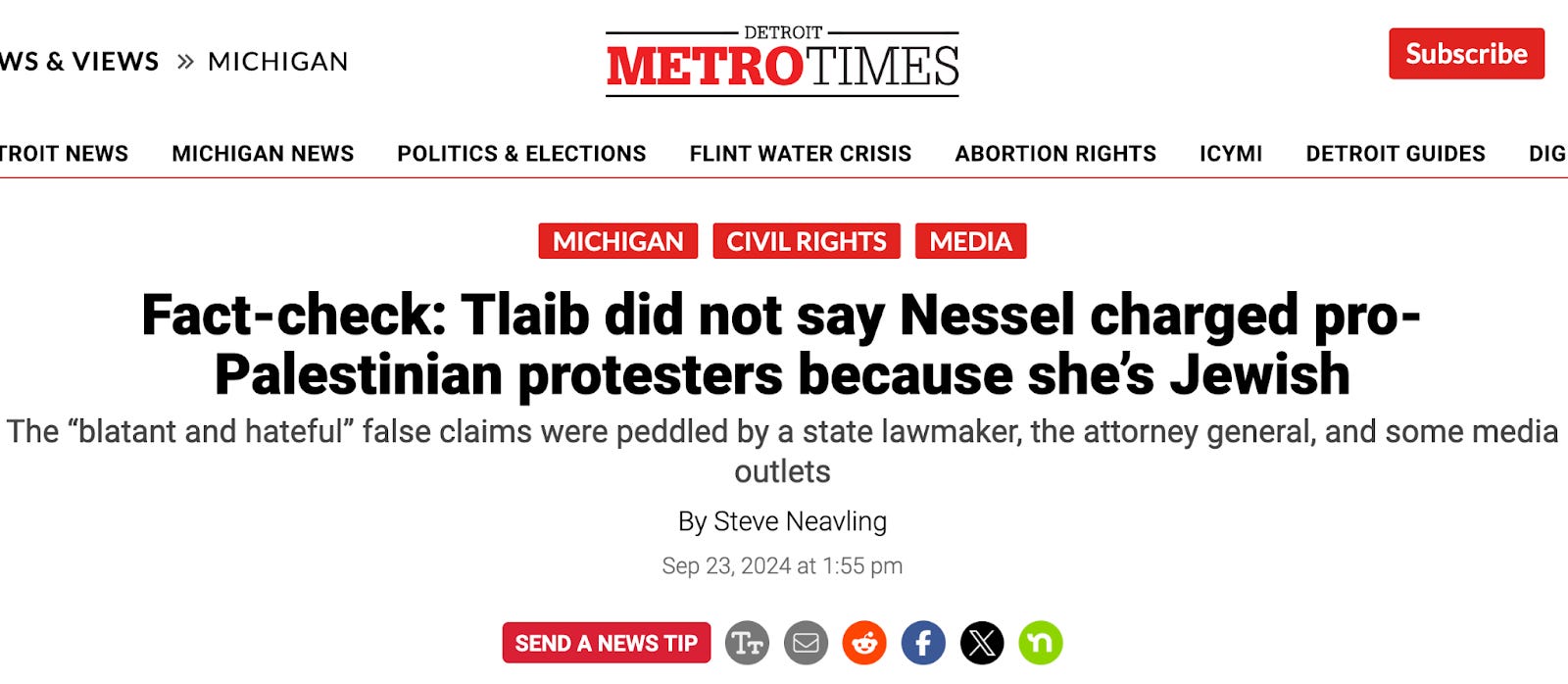 “Tlaib never once mentioned Nessel’s religion or Judaism. But Metro Times pointed out in the story that Nessel is Jewish, and that appears to be the spark that led to the false claims.”